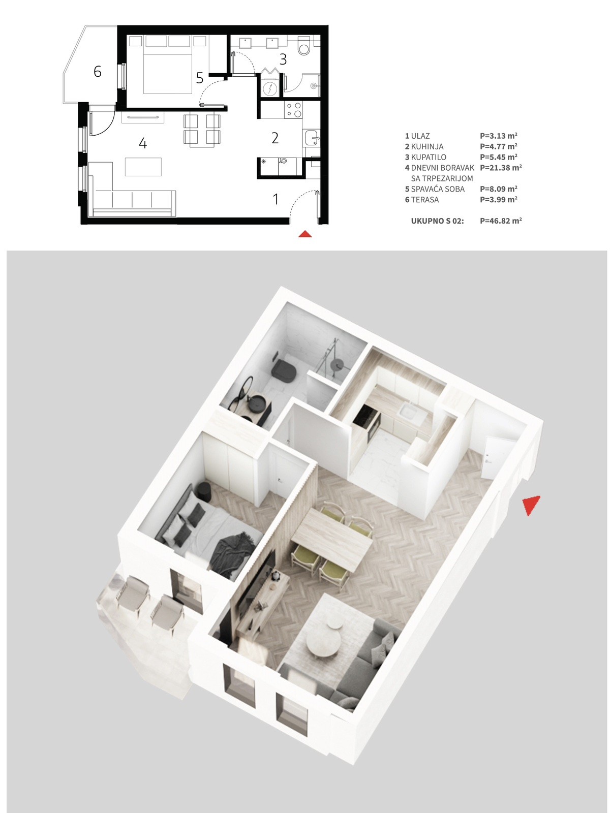 Kvadratura: 46,82m2 (ukupna), 46,82m2 (uknjižena)