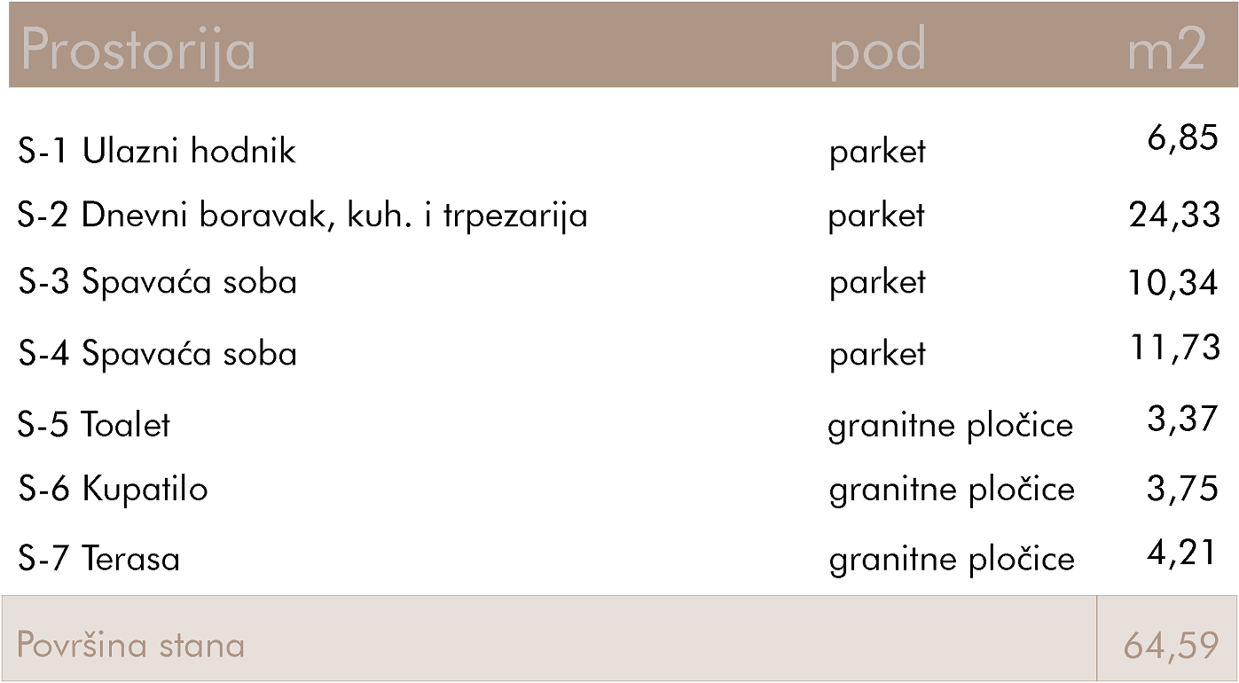 Kvadratura: 64,59m2 (ukupna), 64,59m2 (uknjižena)