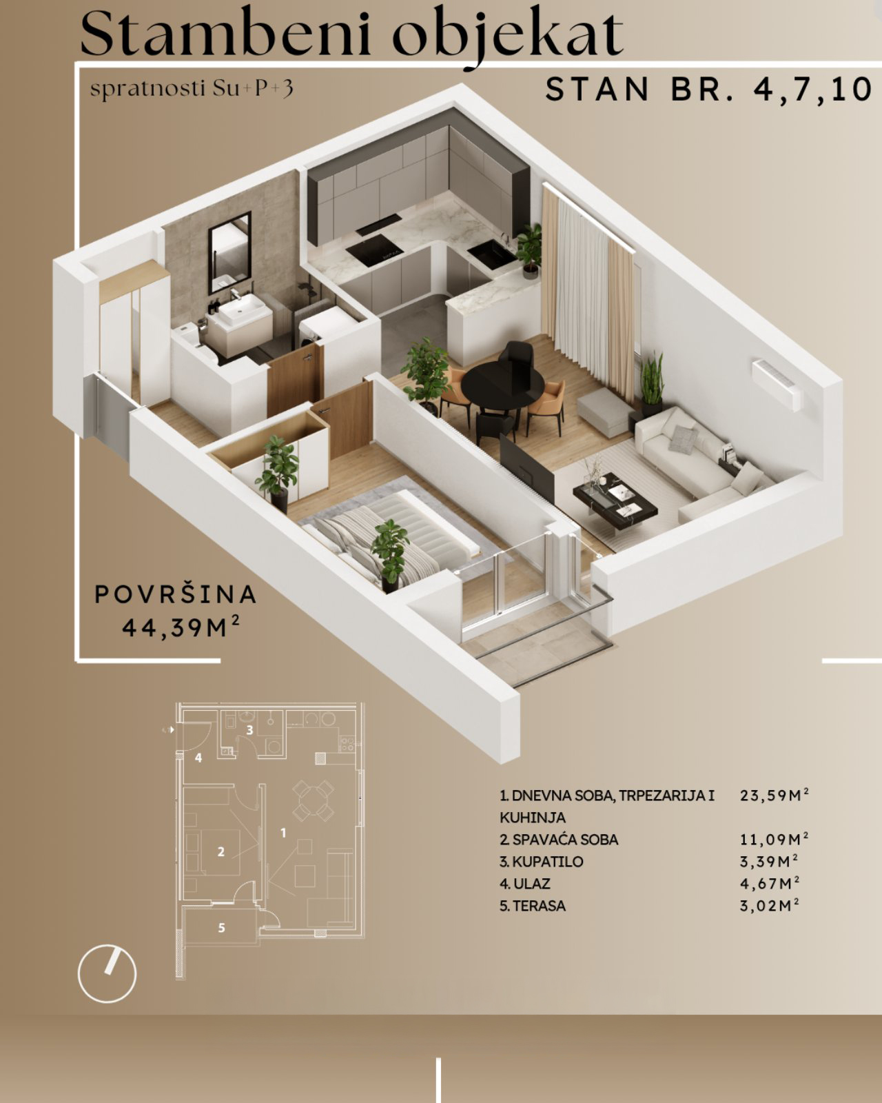 Kvadratura: 44,39m2 (ukupna), 44,39m2 (uknjižena)